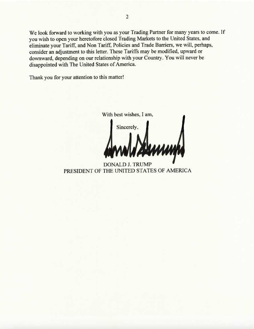 特朗普通过他创建的“真实社交”平台陆续公布了致这些国家领导人的信件,详细说明了加征关税的原因,并强调这次调整不涉及其他行业的关税。