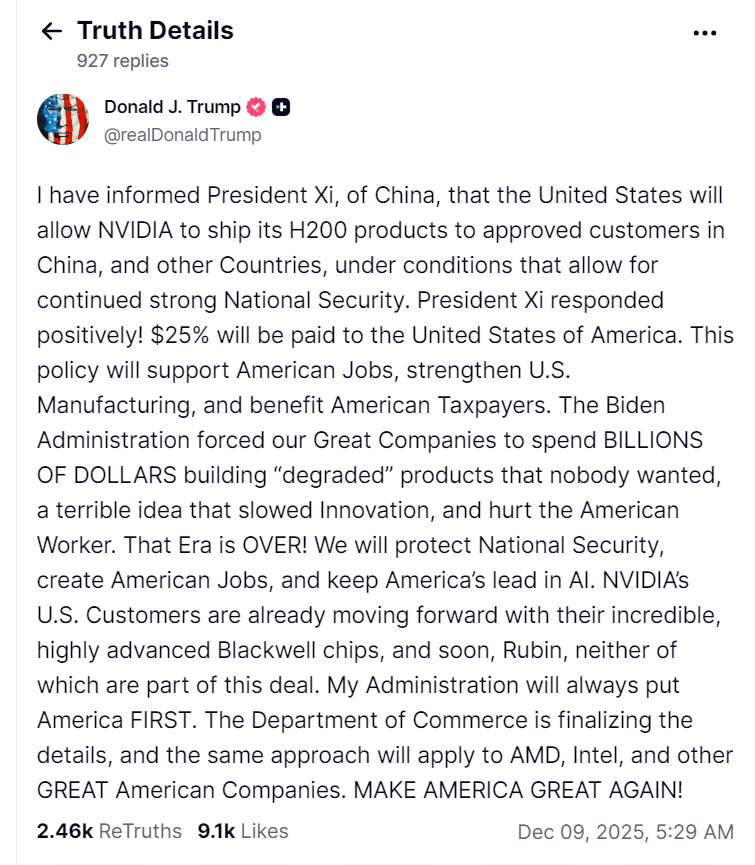 特朗普在其真相社交上宣布了这一决定,从而结束了他与顾问们就是否批准向中国出口H200芯片而进行的数周讨论。