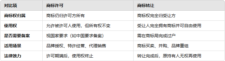 商标转让与商标许可不同,转让是永久性的权利转移,而许可只是允许他人使用商标,商标权仍归原所有人。