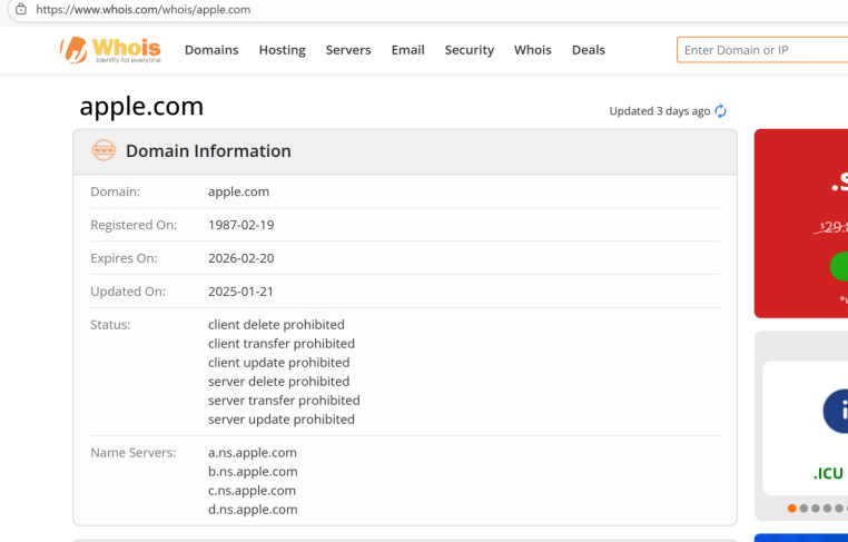 一般情况下,通过WHOIS查询可以获取到域名的详细信息,包括注册状态、注册人、注册日期、到期时间以及域名服务器等关键数据。例如,访问 WHOIS 官方网站:https://www.whois.com/whois/apple.com,可以看到该域名注册情况,如下图。