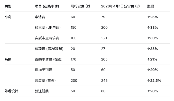 2025年11月5日,英国知识产权局(IPO)发布最新通知:将从2026年4月1日起提高专利、商标和外观设计专利的费用,费用将平均增加25%。这是自2018年专利费、2016年外观设计专利费和1998年商标费以来IPO首次调整费用标准。