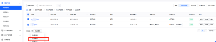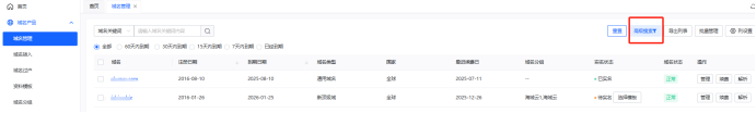 (2)批量域名解析,在域名列表页面,点击高级搜索,批量输入要解析的域名,勾选上搜索出来的域名列表>批量管理>批量解析。