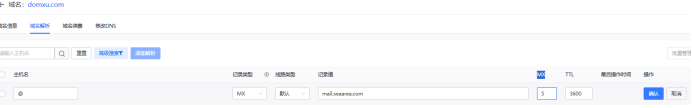 示例如下:主机名(通常指子域名的前缀,若域名是www.example.com 填写WWW,若域名是example.com,填写@)记录值(参照邮箱提供商提供的记录值添加)MX优先级(通常优先级设置是5或10),其余值默认。