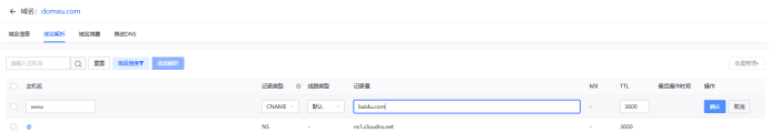 示例如下:主机名(通常指子域名的前缀,若域名是www.example.com 填写WWW,@会跟NS记录值冲突)记录值(通常指向其他的域名),其余值默认。