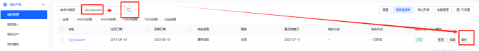 (1)单个域名解析,在域名列表页面输入域名单击搜索框并选择域名单击解析。