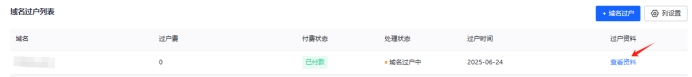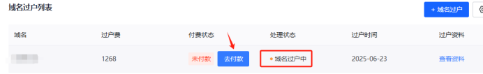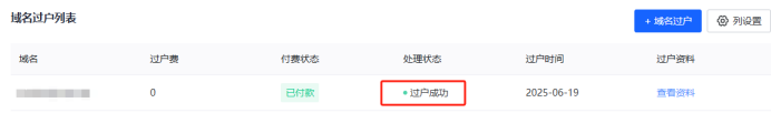 在域名过户列表中,可以查看到订单的过户状态。过户中的域名订单状态会显示为“域名过户中”;若过户已完成,订单则会显示“过户成功”。