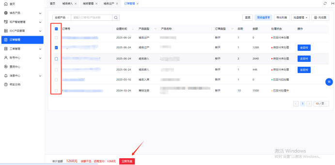 3、若未及时支付订单,可在“域名过户列表”或“订单管理”支付所需的过户订单或者删除无需过户的订单。只有在订单是未付款的状态下才能删除订单。