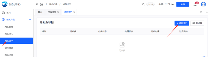 1、登录会员中心,在侧边栏的“域名产品”的“域名过户”下,点击“+域名过户”,选择需要过户的域名和新持有人模板,进入下一步并提交订单。若您需要对不同的域名选择不同的模板信息,请分批下单。