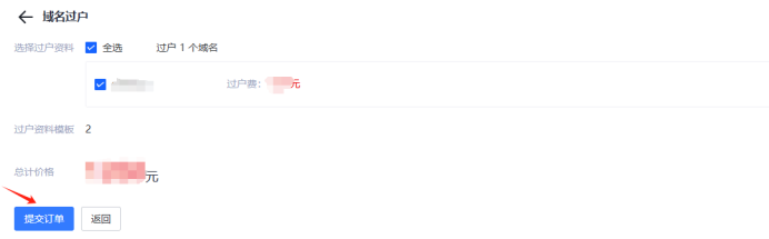 2、核对订单金额,确认无误后,点击提交订单。若有过户费用,需支付。